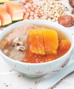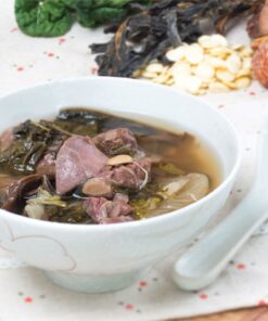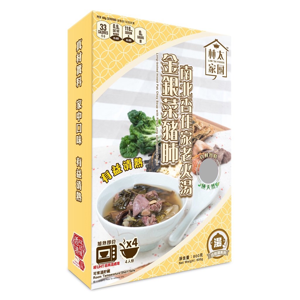 精選天然於矖菜乾, 新鮮白菜, 豬肺、豬展肉、瘦肉、蜜棗、南北杏;按獨有食品生產工藝控制熱處理溫度煮至最合適如日常媽咪, 太太家中用心煲的老火湯般口味。享用日常家庭靚湯之餘亦省確煲湯時間, 亦因節能對環保作貢獻。此產品經超高溫處理,可在常溫長期保存。加熱即食。